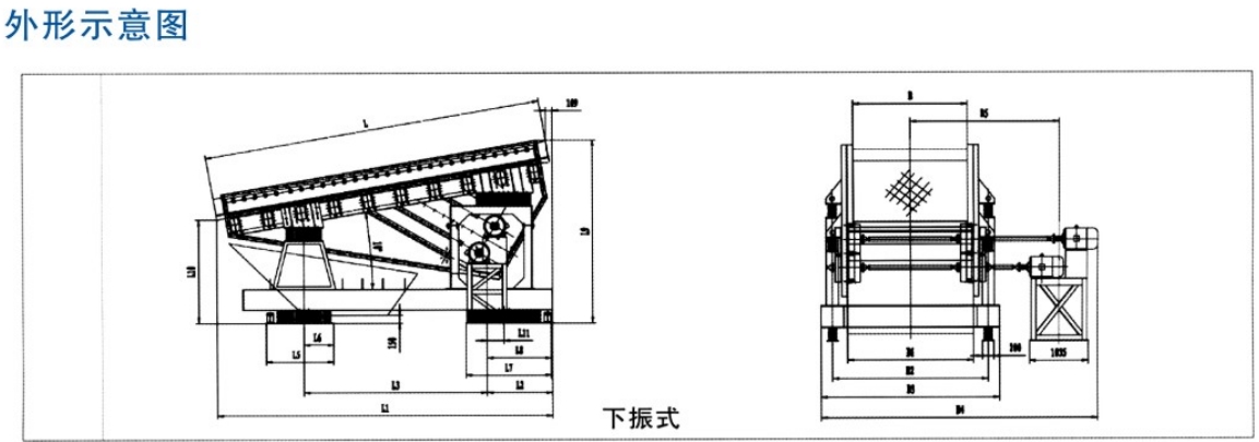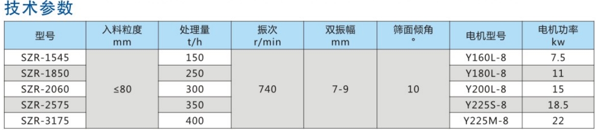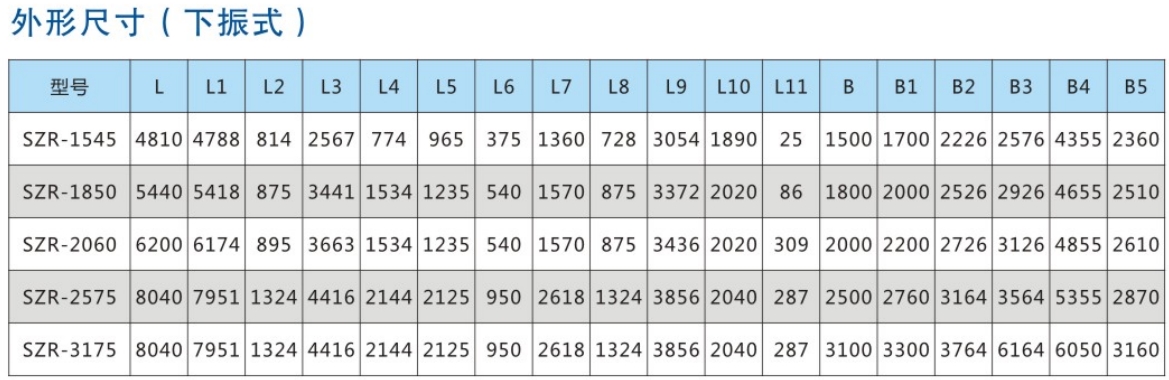 SZR系列熱礦振動篩均為座式安裝。采用雙軸激振器,電機不參振;由兩臺電機外拖動激振器作反向自同步旋轉,使篩體沿直線方向作周期性往復運動,從而達到篩分目的。